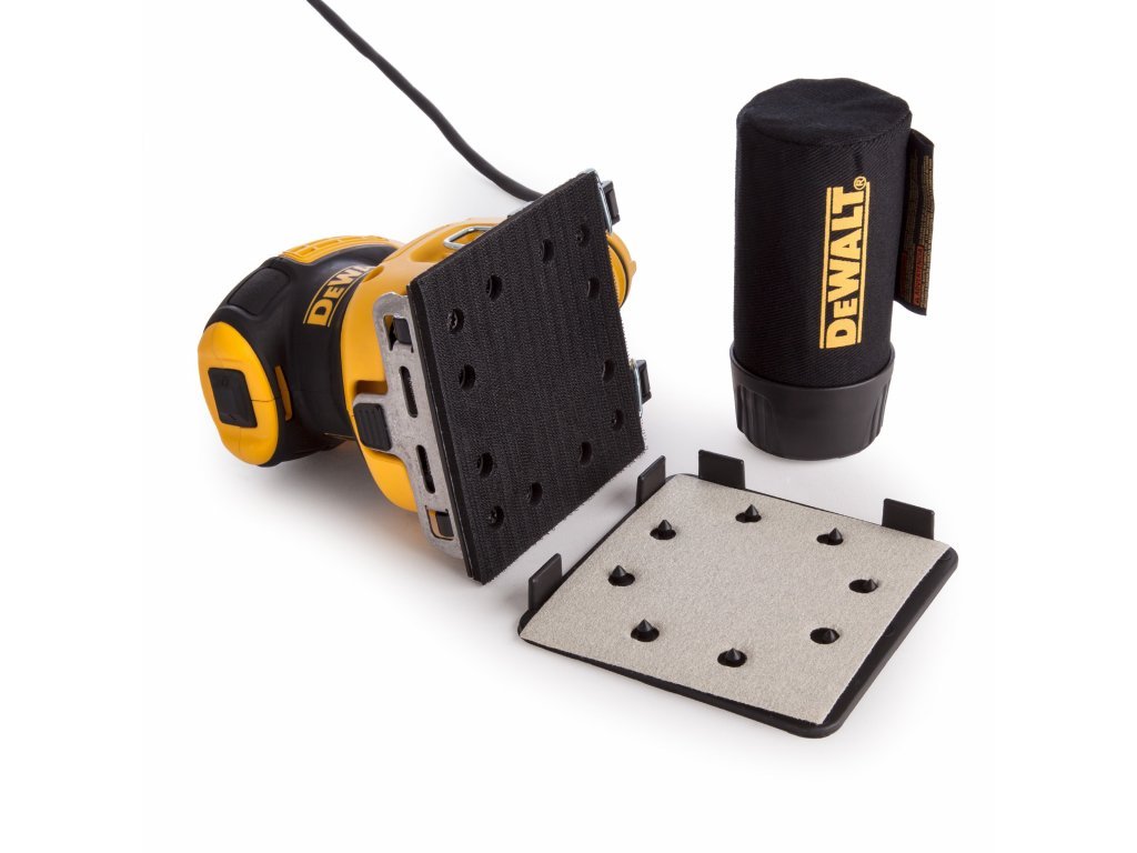 - Upínání pomocí suchého zipu umožňuje rychlejší výměnu brusného papíru, lepší odstraňování prachu a vyšší účinnost broušení