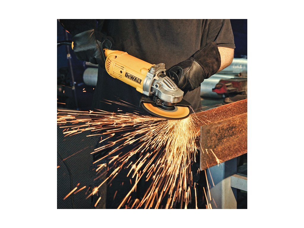 Úhlová bruska DeWALT DWE496 s kotoučem o průměru 230mm a příkonem 2600W vybavená plynulým rozběhem a beznapěťovým spínačem.